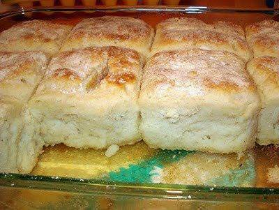 Pat dough out and cut biscuits using a round biscuit / cookie cutter. Melt butter in bottom of cookie sheet pan or 9×13 casserole dish.