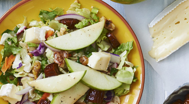 - Combine salad, apple, dates, walnuts, onion and Brie in large bowl. Toss with Apple Dijon Vinaigrette, until coated as desired. Season with salt and pepper, to taste.