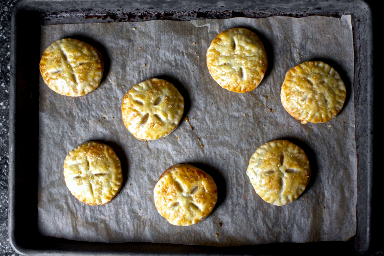 And now, assemble away! Grab your first disc of chilled dough and lightly dampen it on one side with the water. This is to help it seal. Take your first disc of apple and toss it in the cinnamon spice sugar. Place it on the damp side of the bottom disk. Place a second disc of dough on top; I found it easiest to seal it by picking the whole thing up (this is when you’ll be glad that your dough is cold and semi-firm; if it’s soft and getting sticky, chill it until it’s easy to pick up) and press the tops and bottoms around the apple with your fingers. Back on the floured counter, cut decorative slits in your “pies”. Dip your fork in the flour and use it to create a decorative crimp on the sealed edges. Brush your cookie with egg wash and sprinkle with coarse sugar. Replace on baking sheet and chill while you prepare the others. About now, you’ll curse your friendly food blogger for getting you into such an exacting cookie making process but I promise, the first couple are slow and the rest come together very quickly.