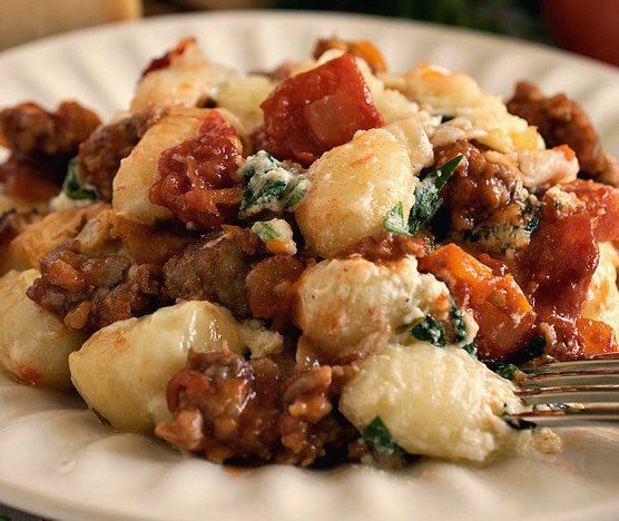 - In a 2 quart casserole dish, layer half the meat sauce, all of the ricotta mixture, all of the gnocchi, the second half of the sauce and the remaining Parmesan. Top with the mozzarella and bake for 30 minutes uncovered.