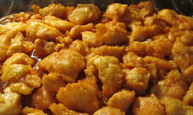 Start by preheating your oven to 325 degrees. Rinse your chicken breasts in water and then cut into cubes. Season with salt and pepper to taste. Dip chicken into the cornstarch to coat then dip into the eggs. Heat your 1/4 cup oil in a large skillet and cook your chicken until browned but not cooked through. Place the chicken in a 9×13 greased baking dish. Mix all of your sweet and sour sauce ingredients in a bowl with a whisk and then pour evenly over the chicken. Bake for one hour and during the baking process you will need to turn the chicken every 15 minutes.