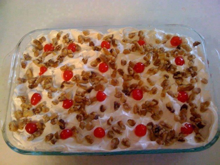 Drain the crushed pineapple well and layer it over the sugar/egg layer, next layer the sliced bananas and the sliced strawberries. Next cover this with whipped topping. Drain the maraschino cherries and place them on top either randomly or on what would be each serving. Sprinkle walnuts on top. Chill for about 2 hours before serving.