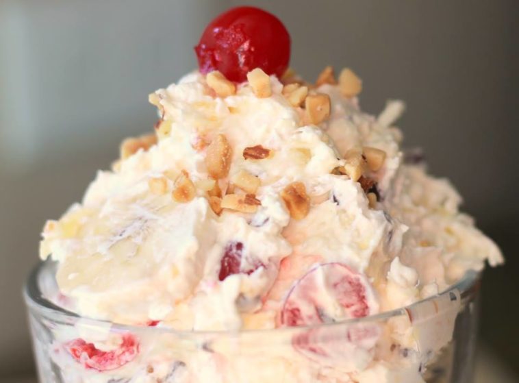 Gently stir in the marshmallows, nuts, chocolate chips, bananas, and cherries.