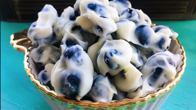 Mix honey and yogurt. Stir in blueberries and almonds. Place them in a tray to freeze. Freeze 2 hours for solid results. 18-25 frozen protein bites.