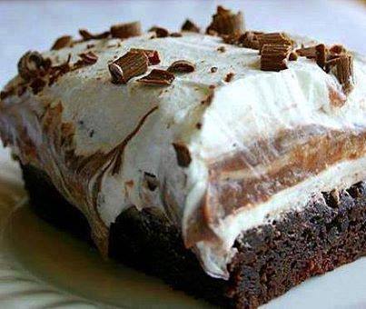 Mix brownie mixes according to directions. Add egg. Bake in brownie pan. Mix cream cheese, powdered sugar and 1 container whipped topping. Put this mix on top of the cooled brownies. Blend puddings and milk together and put on top of the cream cheese mixture. Top with another layer of whipped topping. Put chocolate shavings or chocolate syrup on top. Refrigerate until ready to serve.