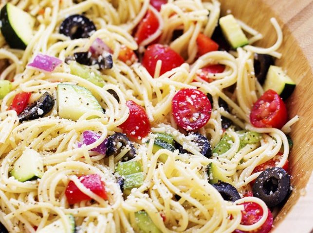 Cook the pasta according to package directions. Drain and rinse in cold water. Add cherry tomatoes, zucchini, cucumber, green and red bell pepper, red onion and olives in a large bowl.