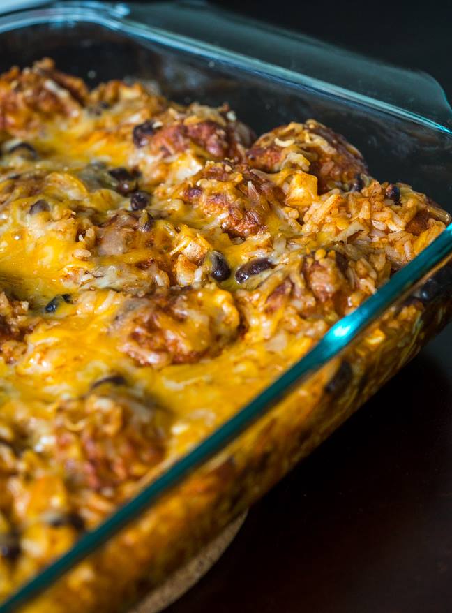 We’ll start by saying this: while you’re absolutely more than welcome to make your meatballs from scratch – yummm – we used a big bag from the frozen section, since we just did not have the time to make them ourselves. We loved the end result, with meatballs that were perfectly sauced up and not at all dried out…if it’s a shortcut that will shave hours off your prep time and give you the same delicious results?? Go for store-bought here, you won’t regret it. We then mixed those meatballs with white rice, black beans, onion, cheese and enchilada sauce. The ratio of all these ingredients is perfection and you’ll seriously be craving this thing long after you’ve polished off the 9×13.