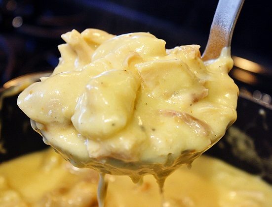 Once liquid begins to thicken, add diced chicken. Let this mixture cook, covered, for approximately 20 minutes, stirring occasionally. When the biscuits are no longer doughy but firm, it is ready to be served.