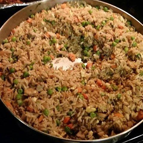 Heat oil in same skillet; add onion and saute until soft. Then add rice, soy sauce, pepper and chicken. Stir fry together for about 5 minutes, then stir in egg. Serve hot.