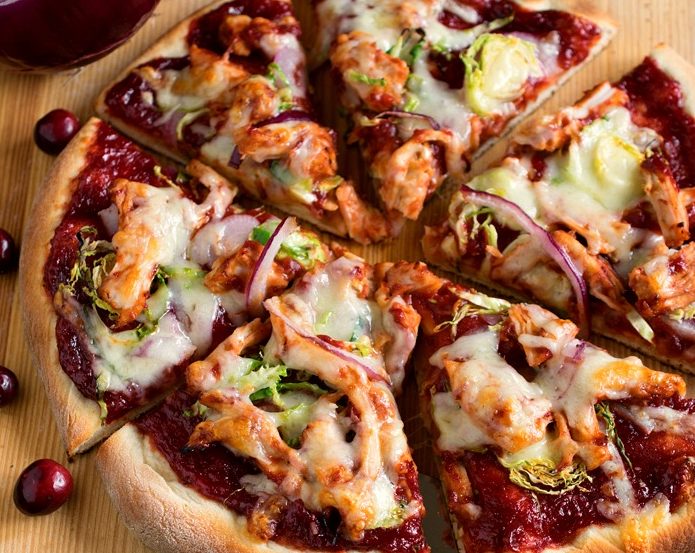 6. Place one quarter of the remaining Cranberry Barbecue Sauce(1/4 cup) on the pizza dough, spreading to within a half inch of edges.