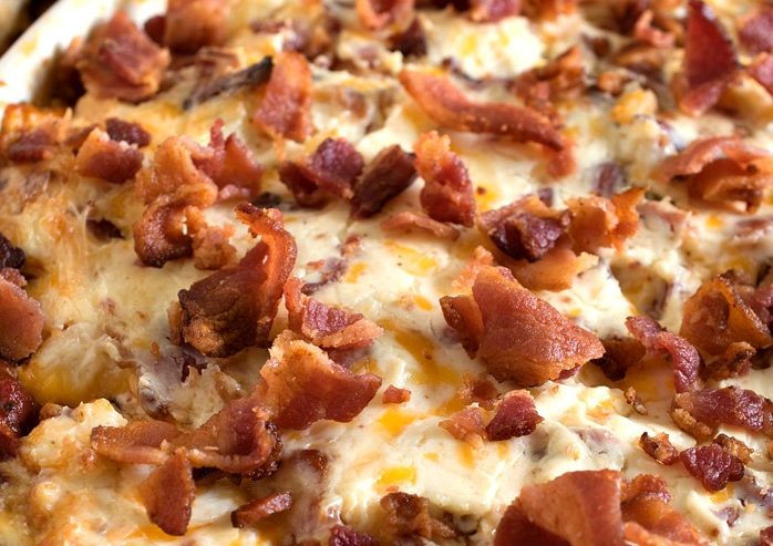 - Remove the dip from the oven, sprinkle the top with the reserved crumbled bacon and serve with toasted baguette slices.