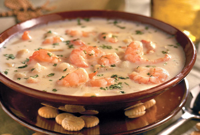 • Mix in the potatoes, shrimp, wine and salt. Heat, stirring occasionally. Serve and enjoy!