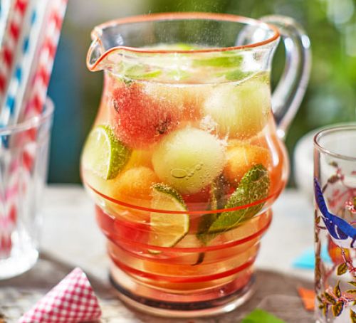 Using a melon baller, scoop out as many melon balls as you can. Add them to the jug and leave to steep for 30 mins-1 hr in the fridge. Top up with sparkling water and add the remaining mint leaves just before serving with extra lime wedges.