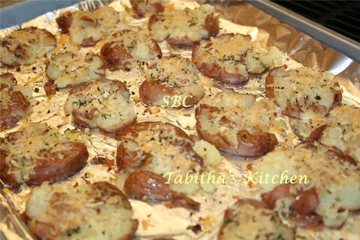 Preheat oven to 425 degrees. Boil the baby potatoes in salted water until fork tender. Cover baking sheet with foil and drizzle olive oil on the baking sheet. Space the potatoes on the lined baking sheet sheet and mash them gently with a fork or potato smasher.
