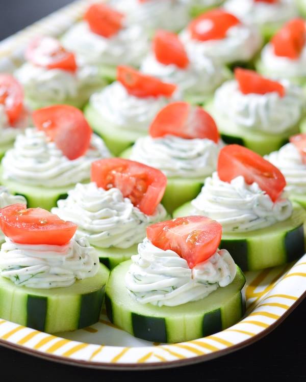 Pipe the cheese mixture onto the cucumber rounds, then top with a tomato half!