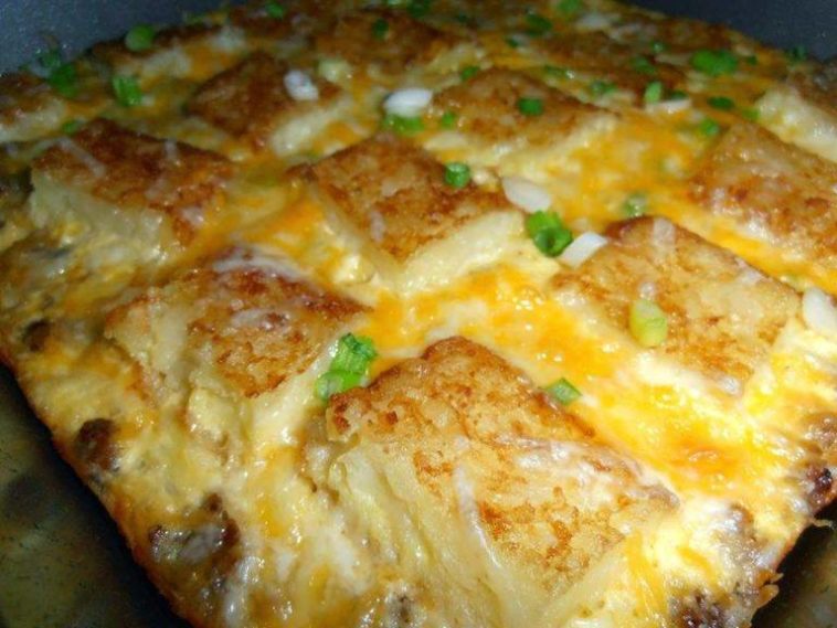 Brown and crumble the sausage in a skillet. Drain off any grease and spoon the sausage into the bottom of a 9×9 baking dish. Sprinkle half of the green onions over the sausage. Whisk together the eggs and milk, pour over the sausage. Top with 1 C. of the cheese. Place the hash browns on a plate and pop in the microwave for 30 seconds to soften enough to cut. Cut each patty into 6 pieces. Place on top of the cheese. Bake in a 350 degree oven for 25 minutes. Remove and top with remaining cheese and green onions, return to the oven for 5 mins.