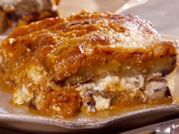 5. Spread half of the marinara sauce on the bottom of the prepared baking dish. Lay 4 slices on top followed by the ricotta mixture. Lay another 4 slices of eggplant and finish with marinara sauce. Top with the remaining 1/2 cup Parmesan. Bake until golden brown, at 350 degrees, for 30 minutes.