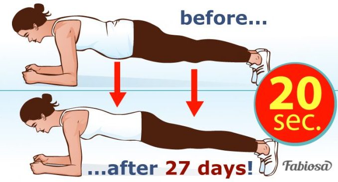 The plank does not give immediate results, however, if you are patient, the results will be amazing. What you have to do is hold the plank for for four weeks. The first week you will have to stay in the position for 20 seconds, after a while, you should slowly and steadily increase the your stamina until you can do it for four minutes. Just follow the next plan we are about to present you.