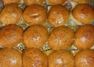 Mix together with a small whisk. Brush tops of ham and cheese rolls liberally with sauce, then pour remaining sauce over all. Cover pan with foil and refrigerate for 4 to 24 hours. Preheat oven to 350 degrees. Bake rolls, covered, for 10 minutes, then remove foil and bake another 10 to 15 minutes until the tops are golden brown.