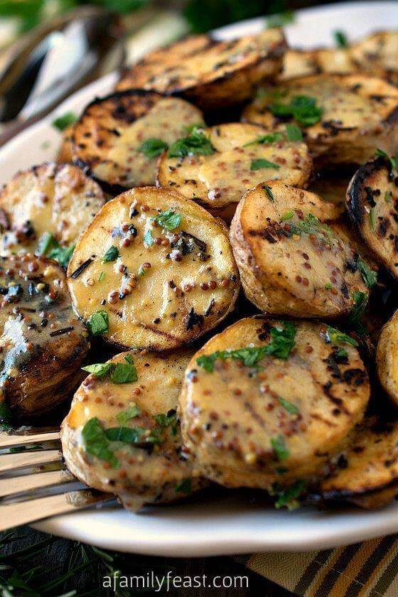 As soon as the potatoes come off the grill, toss lightly with the dressing (serve extra dressing on the side) and sprinkle remaining two tablespoons of parsley over the top