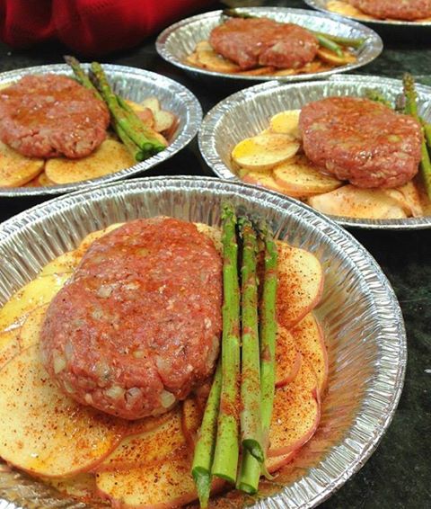 2. To make 6 Meat Patties- mix 1.5 pounds 85% lean ground beef, 2 eggs, 1 1/2 tsp. Dijon, 1 Tbsp. Worcestershire sauce, 1 tsp. salt and 1/2 tsp. pepper, and 1/2 cup finely chopped onions. Divide into 6 one inch thick patties.3. Top each pan of potatoes with a meat patty and sprinkle the potatoes generously with seasoned salt or garlic salt and pepper, then drizzle with a olive oil, especially over the potatoes.