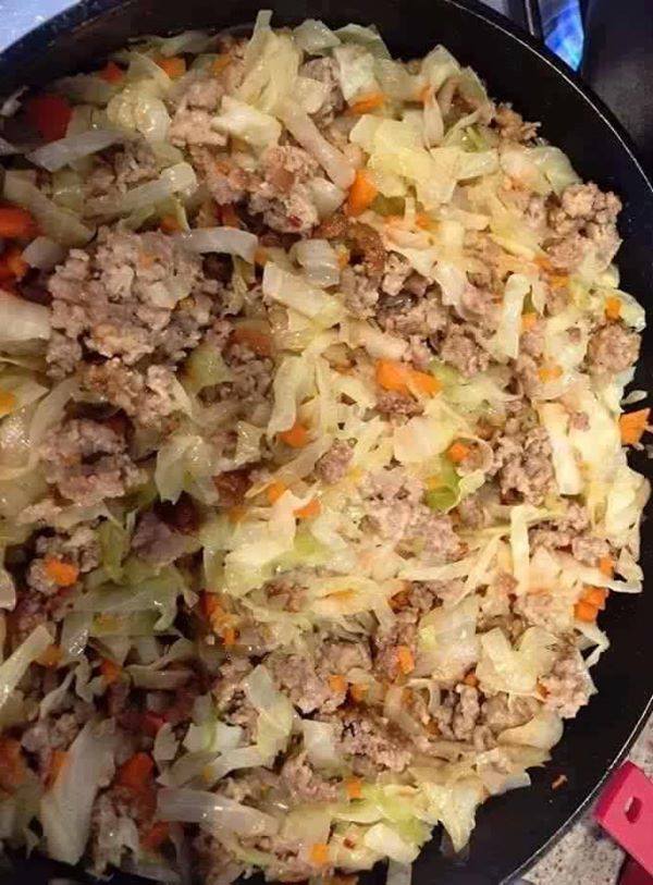 Brown the sausage in a large skillet and add the other ingredients right on top. Cover and cook on the stovetop about 5 min on med. remove lid, stir/toss and taste. Finish to your taste/texture preference.