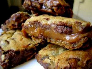 While the cookie dough is baking melt caramels and evaporated milk in a double boiler. Add peanut butter after caramels are melted. Melt thoroughly. Spread over baked cookie dough base.
