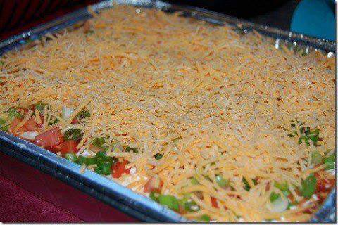 Beat cream cheese and sour cream together til smooth, add taco seasoning. Spread on large glass dish…top with lettuce, Green onion (if you like onion) Tomatoes and black olives sliced. Top with cheddar cheese…use any corn chips you desire. Best part of this is you can add more or less toppings to the base depending on tastes and kids love it too. I recommend using disposable 9×13 aluminum pan if taking this dish to a party or picnic. It can be split into 2 round cake pans if you have picky eaters too!