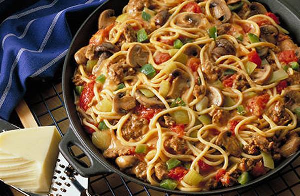 In a large skillet sauté beef over medium-high heat, breaking it up with a spoon; drain off any fat. Add garlic, mushrooms, onion, green bell pepper, Italian seasoning and salt. Cook stirring occasionally, for about 5 minutes or until vegetables have softened.