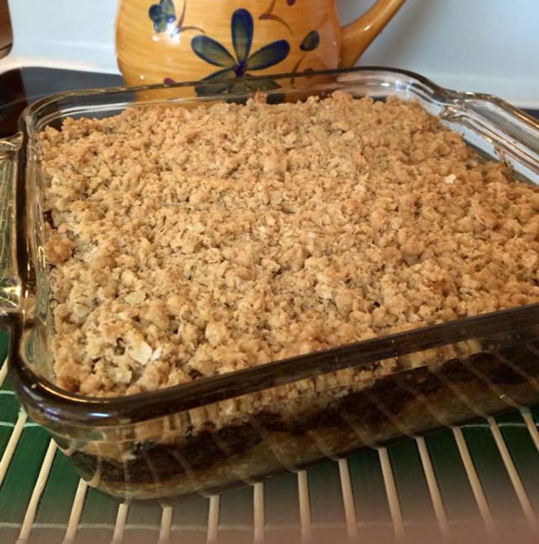 Mix all ingredients together until they form a crumble. Press half into an 8 x 8 pyrex dish.