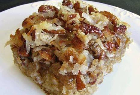 Combine all ingredients and mix thoroughly. Carefully spread frosting over the top of the cake. Broil until coconut is just brown. Watch very closely – it doesn’t take long. Cool, slice and serve.