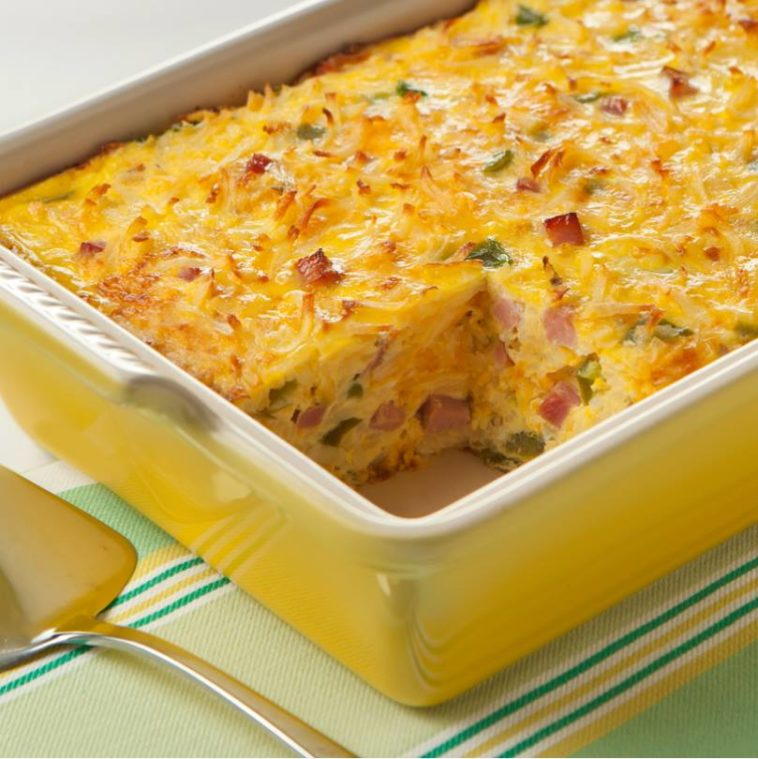 Mix together the eggs and cream in a large bowl and mix in the cheese, ham, green pepper and onion.