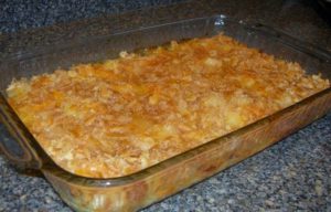 Next, sprinkle crushed Ritz crackers over it. Melt margarine and add pineapple juice. Pour over entire mixture. Bake 30 min at 350 degrees. This is a great side dish with ham!