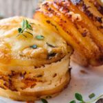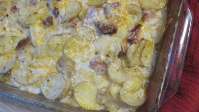 Preheat the oven to 350 degrees F. Since I used Yukon Gold potatoes, I left the peels on. If using russets, they need to be peeled. So, slice all the potatoes, using a mandolin or a knife. In a 12 inch skillet, melt the butter and add in the diced onion. Saute the onion for about 2 minutes, then sprinkle in the flour. Stir and cook for about 1 minute. Pour the milk into the skillet and stir until the mixture begins to thicken. Add in the ham, and heat one minute. Add the cream, and also the potatoes. Taste and adjust the salt and pepper if needed. Butter a 9×13 inch baking dish. Pour half of the potato mixture into the baking dish. Sprinkle with half the cheese. Top with remainder of the potato and cream mixture. Top with the remaining cheese. Cover dish well with aluminum foil. Bake for 50 minutes covered. Then, uncover the pan and bake for another 10-15 minutes until cheese is bubbly and potatoes are done. Remove from oven and enjoy!