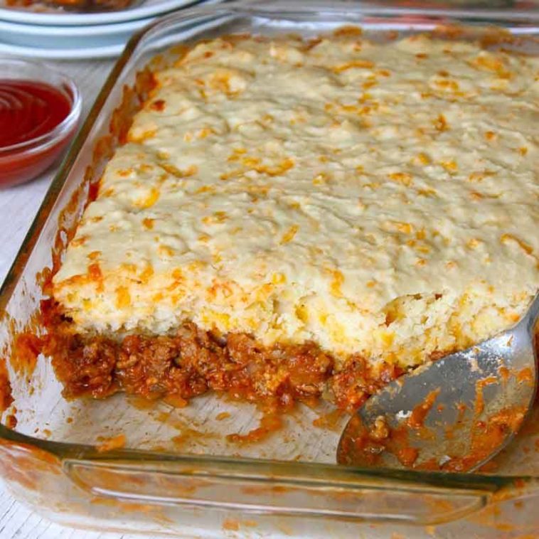 Layer half of frozen tater tots in the prepared baking dish. Spoon the beef mixture on top, then top with 1 cup of the cheese, followed by the remaining tater tots, and the rest of the cheese. Bake until bubbly and golden brown, 45-55 minutes. Serve with chopped pickles. Enjoy!