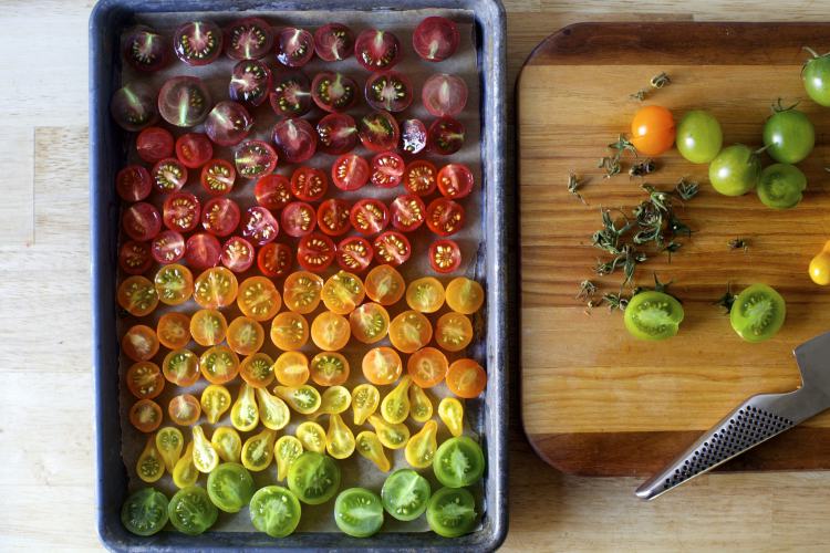 Preheat oven to 225°F. Halve each cherry or grape tomato crosswise, or Roma tomato lengthwise and arrange on a parchment-lined baking sheet along with the cloves of garlic. Drizzle with olive oil, just enough to make the tomatoes glisten. Sprinkle herbs on, if you are using them, and salt and pepper, though go easily on these because the finished product will be so flavorful you’ll need very little to help it along.