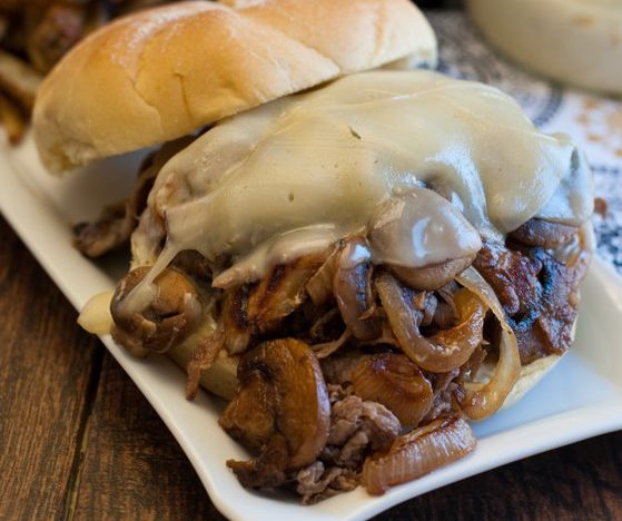 - Add onions and mushrooms to the steak, stir to combine and turn off heat. Place provolone slices over the steak mixture and cover pan to melt the cheese, about one minute.