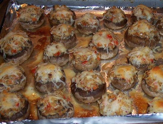 Fill caps of mushrooms distributing among them and top with shredded cheese.