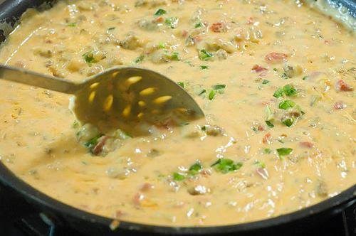 Brown ground beef or sausage (or both) in a pan over medium heat and set aside. Cut up the Velveeta and cream cheese into cubes and place into a crock pot. Pour in the Rotel and the cream of mushroom soup and stir ingredients together. Place the crock pot on low setting for an hour, letting the ingredients meld. After about 30 minutes, add the browned meat and continue to let cook, stirring as needed.
