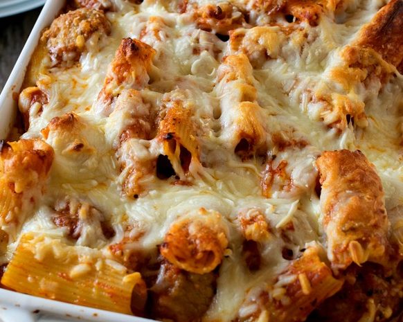 - Mix 2 cups of tomato sauce with the drained rigatoni and pour one third of this into the pan, reserving the other two thirds for different layers.