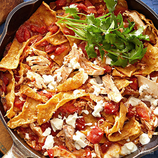 Set aside a few of the baked tortilla strips. Gradually stir the remaining tortilla strips into the chicken mixture; heat. Remove from heat; sprinkle with cheese. Top with cilantro sprigs and the reserved tortilla strips. In a bowl combine sour cream and milk; serve with the casserole.