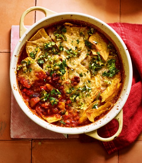 2. Heat the oven to 220°C/200°C fan/gas 7. Add the beans, chopped coriander stalks and the lime juice to the chilli on the hob. Cook for 5 minutes, then remove from the heat and cover the top with layers of tortilla chips and grated cheese. Bake for 10-15 minutes until golden brown and the cheese has melted.
