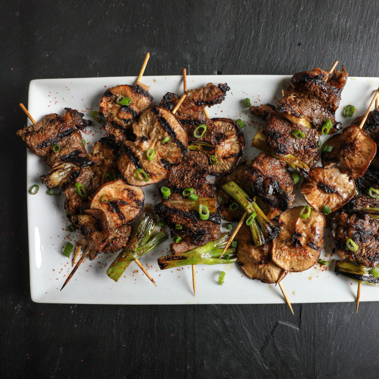 Alternately thread the beef and scallions onto half of the skewers. Thread the mushrooms on the remaining skewers. Brush with rice bran oil. Season with salt and pepper.