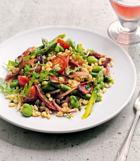 Wash and cook the wheat or rye berries in boiling water according to the packet instructions, then drain. When the berries are almost cooked, blanch the asparagus and broad beans in a medium pan of boiling salted water for 2 minutes. Drain and set aside to cool a little, then pod the broad beans and transfer to a large bowl with the asparagus and drained berries.