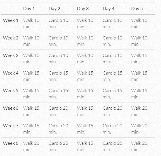 Your mission is to make walking a part of your daily life. The first step is simply to get up and get moving. Three days a week you’ll walk for short periods of time and twice a week you’ll choose a favorite cross-training activity such as cycling, dancing, or working out to a DVD. Give yourself 2 days off to allow your muscles to recover (choose days that work best for you).