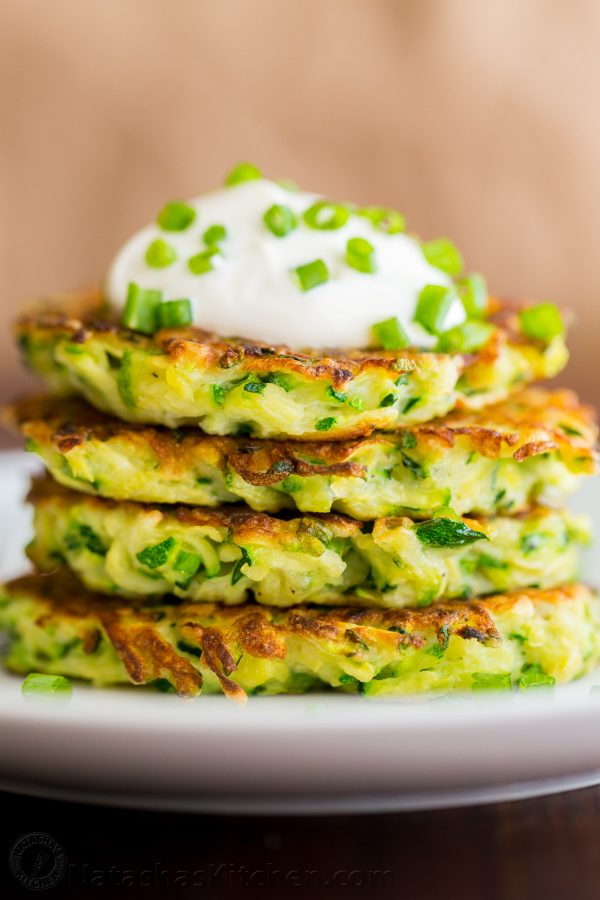 5.Place a large heavy bottomed cast iron or non-stick skillet over medium-high heat*. Add 2 Tbsp olive oil over medium high heat. Once the oil is hot, add the zucchini mixture a heaping tablespoon at a time** and flatten out the tops slightly to make them pancake shaped. Sauté 3-5 minutes per side or until golden brown. If they brown too quickly, reduce the heat. Serve warm with a dollop of sour cream.